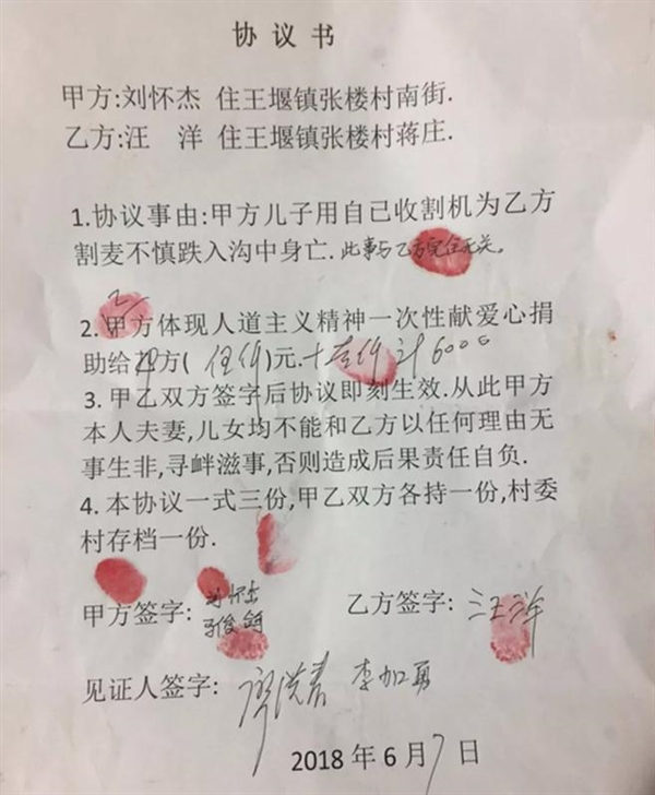 6月7曰,历经早9点到下午7点,张楼街道已是灯火通明,在经历一番的交流和勾通刘xx的儿媳马xx和汪xx达成相互体谅.汪xx体现人道主义精神自愿向死者家属一儿一女送上慰问金6000元,派出所李加勇捐献1000元,王堰镇党委政府,张楼村委会积极为死者儿女申请低保,捐献1000元,作为遗孤的学费,生活之需,两家人握手言和,喜极而泣.